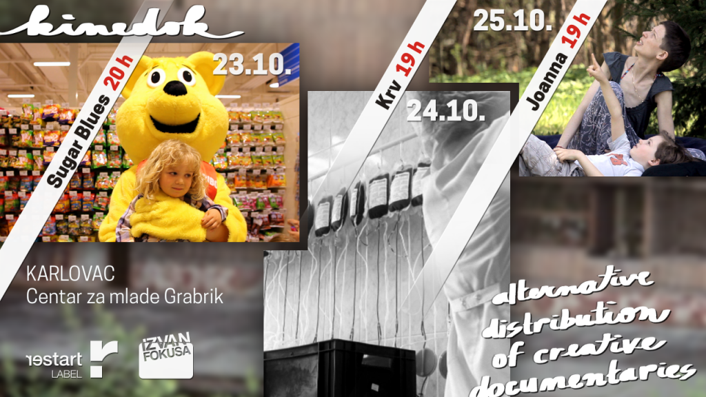 U partnerstvu sa 'Restart', a uz vodstvo 'Instituta dokumentarnog filma iz Praga', udruga Izvan fokusa u Karlovcu provodi projekt „KineDok“. U sklopu projekta u Karlovcu će se u dva vikenda održati 6 projekcija dokumentarnog filma. Od ovog petka 23., 24., i 25.10. u Centru za mlade Grabrik očekuju nas filmovi 'Sugar Blues' (Češka), 'Krv' (Rusija) i 'Joanna' (Poljska) uz besplatan ulaz te diskusiju.