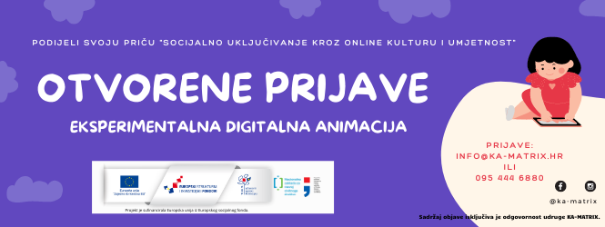 Udruga KA-MATRIX nastavlja s provedbom projekta „Podijeli svoju priču – socijalno uključivanje kroz online kulturu i umjetnost“ u partnerstvu s umjetničkom organizacijom FORMAT C iz Zagreba koji je sufinancirala Europska unija iz Europskog socijalnog fonda.  Prijave za radionice "Eksperimentalne digitalne animacije" su otvorene do 30.11.2021. i ograničena su na 15 sudionika.