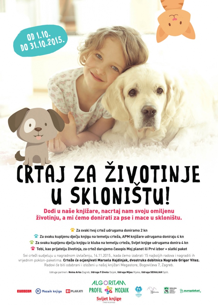Tijekom listopada u svim knjižarama Algoritam Profil Mozaika pa tako i u karlovačkoj na Korzu (Trg Petra Zrinskog 13) odvija se simpatična humanitarna akcija “Crtaj za životinje u skloništu”. Svi zainteresirani mogu doći u jednu od knjižara i nacrtati svoju omiljenu životinju, time pomoći životinjama u skloništu, a ujedno i biti dio nagradne igre.