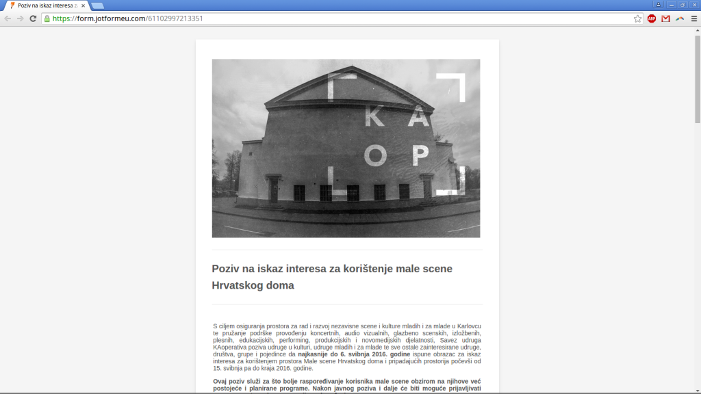 26.4.2016. godine službeno je otvorena Mala scena Hrvatskog doma. Grad Karlovac je tada investirao ukupno 1,25 milijuna kuna u obnovu 300 četvornih metara, dok je upravljanje Malom scenom Hrvatskog doma preuzela gradska tvrtka Mladost. Tijekom 3 godine brojne udruge, pojedinci i mladi inicijatori, organizirali su brojne događaje poput koncerata, partija, radionica, projekcija, društvenih događaja, rasprava i sl.. 8. travnja 2016. godine, KAoperativa je preuzela stvar u svoje ruke te preuzela upravljanje, a samim www.kaportal.hr odradila je svoj prvi korak.