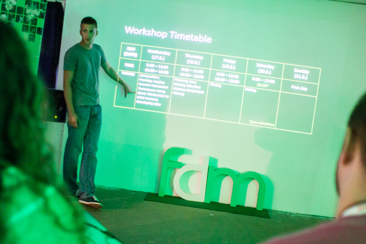 Mladi Nizozemci, koji na ovogodišnjem izdanju festivala sudjeluju samo u edukativnom programu FDM Laboratoriji, odradili su predavanje na temu DSLR snimanja koje je zapravo uvod u šestodnevnu radionicu. Cilj je radionice, koristeći sve popularniju metodu učenja “learning by doing“, osmisliti ideju, napisati sinopsis i knjigu snimanja te snimiti i montirati kratkometražni film na zadanu temu “Sjene“. Važan aspekt radionice čini upravo spajanje i prožimanje fotografske i filmske umjetnosti pa će tako sudionici radionice u praksi učiti kako DSLR kameru, osnovni alat svakog fotografa za snimanje fotografija, na najbolji način iskoristiti za snimanje video materijala i istraživanje granica vlastite kreativnosti.