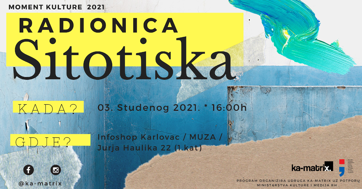 KA-MATRIX - udruga za društveni razvoj u okviru programa Moment kulture organizira radionicu sitotiska koja će se održati u srijedu, 03. studenog od 16.00 sati. Poziv za sudjelovanje otvoren je svima zainteresiranima koje zanimaju osnove sitotiska po "uradi sam# principu. Voditelji radionice pokazati će na koji način jednostavno napraviti otisak na svojoj odjeći, torbi, papiru.